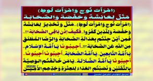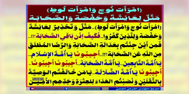 [{امْرَأَت نُوحٍ وَامْرَأَت لُوطٍ}..مَثَلٌ لِعَائِشَةَ وَحَفْصَة وَالصَّحَابَة]…{امْرَأَت نُوحٍ وَامْرَأَت لُوطٍ}..مَثَلٌ وَتَحْذِيرٌ لِعَائِشَةَ وَحَفْصَة وَلِلَّذِينَ كَفَرُوا..فَكَيفَ إذَن بَاقِي الصَّحَابَة؟!!..فَمِن أَيْنَ جِئْتُم بِعَدَالَةِ الصَّحَابَةِ وَالرِّضَا المُطْلَقِ مِن اللهِ عَن الصَّحَابَة؟!!..أَجِيبُونَا يَا أُمَّةَ الإِسْلَام..يَا أُمَّةَ التَّابِعِينَ..يَا أُمَّةَ الصَّحَابَة..أَجِيبُونَا أَجِيبُونَا..أَجِيبُونَا يَا أُمَّةَ الضَّلَالَة..يَامَن خَالَفْتُم الوَصِيَّةَ بِالثَّقَلَيْنِ وَنَصَبْتُم العَدَاءَ لِلعِتْرَةِ وَجَدِّهِم الأَمِين(ص)