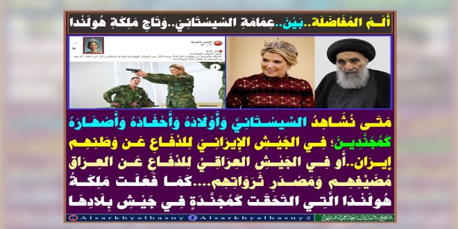 [أَلَــمُ المُفَاضَلَة..بَيْنَ..عِمَامَةِ السِّيسْتَانِيّ..وَتَاجِ مَلِكَةِ هُولَنْدا] مَتَى نُشَاهِدُ السِّيسْتَانِيَّ وَأَوْلَادَهُ وَأَحْفَادَهُ وَأَصْهَارَهُ كَمُجَنَّدِينَ؛ فِي الجَيْشِ الإِيرَانِيّ لِلدِّفَاعِ عَن وَطَنِهِم إيرَان..أَو فِي الجَيْشِ العِرَاقِيِّ لِلدِّفَاعِ عَن العِرَاق مُضَيِّفِهِم وَمَصْدَرِ ثَرَوَاتِهِم….كَمَا فَعَلَت مَلِكَةُ هُولَنْدَا الَّتِي التَحَقَت كَمُجَنَّدَةٍ فِي جَيْشِ بِلَادِهَا