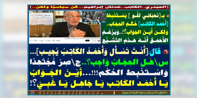 [5]:[بـِـ [نَحَبَانِي لَلُّو] يَسْتَنْبِطُ [أَحْمَد الكَاتِب] حُكْمَ الحِجَاب..وَلَكِن أَيْنَ الجَوَاب؟!..وَيَزْعُمُ الأَحْمَقُ أَنَّهُ هَدَّمَ التَّشَيُّع]