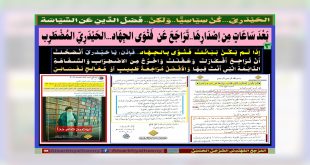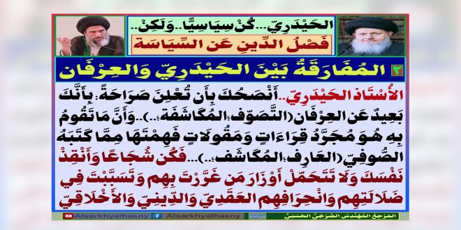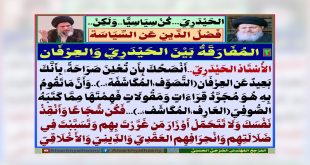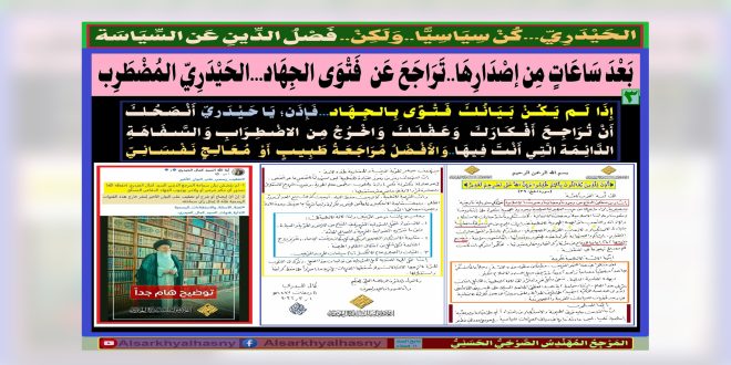 الحَيْدَرِيّ … كُنْ سِيَاسِيًّا .. وَلَكِنْ .. فَصلُ الدِّينِ عَن السَّيَاسَة بَعْدَ سَاعَاتٍ مِن إِصْدَارِهَا… تَرَاجَعَ عَن فَتْوَى الجِهَاد… الحَيْدَرِيّ المُضْطَرِب إِذَا لَم يَكُنْ بَيَانُكَ فَتْوًى بِالجِهَاد… فَإِذَن؛ يَا حَيْدَرِيّ أَنْصَحُكَ أَنْ تُرَاجِعَ أَفْكَارَكَ وَعَقْلَكَ وَاخْرُجْ مِن الاضْطِرَابِ وَالسَّفَاهَةِ الدَّائِمَة الَّتِي أَنْتَ فِيهَا..وَالْأَفْضَلُ مُرَاجَعَةُ طَبِيبٍ أَوْ مُعَالِجٍ نَفْسَانِيّ