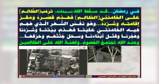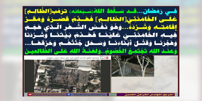 فِي رَمَضَان…قَد سَلَّطَ اللهُ(سُبْحَانَه) ترَمْب[الظَّالِمَ] عَلَى الخَـ..ـامَنَئِيّ[الظَالِمِ] فَهَدَّمَ قَصْرَهُ وَمَقَرَّ إقَامَتِهِ وَشَرَّدَهُ…وَهُوَ نَفْسُ الشَّهْرِ الَّذِي هَجَمَ فِيهِ الخَـ..ـامَنَئِيّ عَلَيْنَا فَهَدَّمَ بَيْتَنَا وَشَرَّدَنَا وَهَجَّرَنَا وَقَـ..ـتَّلَ أَبْنَاءَنَا وَسَحَلَ جُثَـ..ـثَهُم وَحَرَّقَهَا…وَعِنْدَ اللِه تَجْتَمِعُ الخُصُومُ..وَلَعْنَةُ اللهِ عَلَى الظَّالِمِينَ