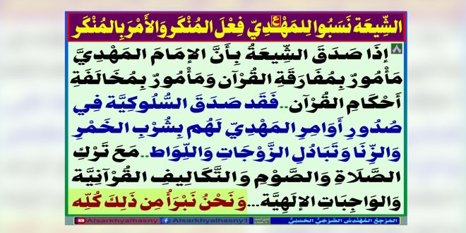 إذَا صَدَقَ الشِّيعَةُ بِأَنَّ الإمَامَ المَهْدِيَّ مَأْمُورٌ بِمُفَارَقَةِ القُرْآن وَمَأْمُورٌ بِمُخََالَفَةِ أَحْكَامِ القُرْآن…فَقَد صَدَقَ السُّلُوكِيَّةُ فِي صُدُورِ أَوَامِرِ المَهْدِيّ لَهُم بِشُرْبِ الخَمْرِ وَالزِّنَا وَتَبَادُلِ الزَّوْجَاتِ وَاللِّوَاط..مَعَ تَرْكِ الصَّلَاةِ وَالصَّوْمِ وَالتَّكَالِيفِ القُرْآنِيَّة وَالوَاجِبَاتِ الإلَهِيَّة….وَنَحْنُ نَبْرَأُ مِن ذَلِكَ كُلِّه