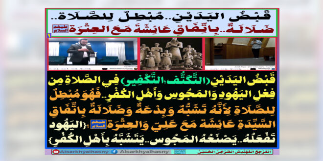 قََبْضُ اليَدَيْنِ(التَّكَتُّف؛التَّكْفِير) فِي الصَّلاةِ مِن فِعْلِ اليَهُودِ وَالمَجُوسِ وَأَهْلِ الكُفْرِ..فَهُوَ مُبْطِلٌ لِلصَّلَاةِ لِأَنَّهُ تَشَبُّهٌ وَبِدْعَةٌ وَضَلَالَةٌ بِاتِّفَاقِ السَّيِّدَةِ عَائِشَة مَعَ أَمِيرِ المُؤْمِنِينَ وَالعِتْرَة(ع)؛ حَيْثُ قَالُوا:{اليَهُود تَفْعَلُهُ..يَصْنَعُهُ المَجُوس..يَتَشَبَّهُ بِأَهْلِ الكُفْرِ}