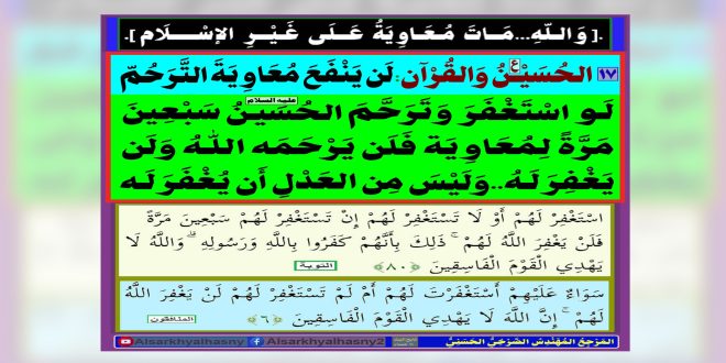 [17]: الحُسَيْنُ وَالقُرْآن:لَن يَنْفَعَ مُعَاوِيَةَ التَّرَحُمّ لَو اسْتَغْفَرَ وَتَرَحَّمَ الحُسَينُ(ع) سَبْعِينَ مَرَّةً لِمُعَـاوِيَة فَلَن يَرْحَـمَه اللهُ وَلَــن يَغْـفِرَ لَهُ..وَلَـيْسَ مِن العَدْلِ أَن يُغْفَرَ لَه